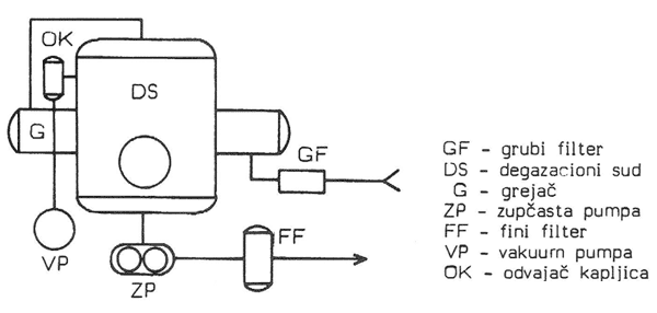 Ulje se direktno uzima iz transformatora, prolazi kroz grubi filter sa snanim magnetom. Zatim se blago zagreva u elektro grejacu. U degazacionom sudu, koji se nalazi pod vakuumom, ulje se raspruje ili prevodi preko specijalnih razvodnih limova i kolona koje u zavisnosti od tipa maine imaju keramicke ispune, i oslobada se vlage i rastvorenih gasova. Na kraju procesa ulje prolazi kroz fini filter kojim se finalno odstranjuju i najsitnije mehanicke necistoce. Na ovaj nain obradeno ulje vraca se nazad u transformatorsko postrojenje.