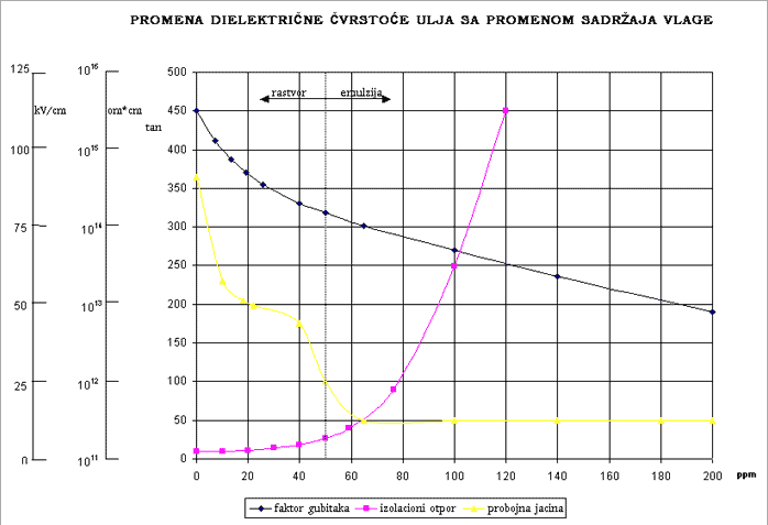 Transformator se sastoji (sasvim uproceno) od tri namotaja ice, koji su potopljeni u posudu sa trafo uljem koje ga hladi, i izoluje od preskakanja varnice koja izaziva poar i razaranje transformatora. Uzimajuci u obzir higroskopnost ulja i njegov lo kvalitet koji cesto postoji i pre unoenja u transformator, preduzece "KONDIC " je razvilo i mobilne maine koje su sposobne da pridu transformatorima i izvre filtraciju ulja na licu mesta, bez potrebe za demontaom i transportom u remontni zavod. Time se postie efikasno odstranjivanje prljavtine, vlage, gasova, vlakana, cadi i elemenata koji nastaju starenjem ulja prilikom rada transformatora, na licu mesta, i smanjuju se trokovi i moguce komplikacije prilikom transporta. Na grafikonu koji je prikazan na sledecoj strani date su vrednosti dielektrice probojnosti, vrednosti tangens delta i izolacionog otpora u zavisnosti od sadaja vlage u ulju u ppm. elimo da istaknemo da su karakteristike ulja precicenog postrojenjem firme "KONDIC" u 92 % slucajeva imala karakteristike dielektricne cvrstoce u vrednostima preko 250 kV/cm za ta posedujemo overene sertifikate Instituta "Nikola Tesla" iz Beograda.